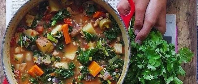 材料:150g鲜蘑菇(切薄片)、350g牛皮菜(即厚合菜,切寸段,红叶绿叶都可以)、3大勺橄榄油(45ml)、2杯西芹丁、3杯胡萝卜丁、一小勺现磨黑胡椒、4片香叶、新鲜百里香少许、5夸脱水(约4730ml)