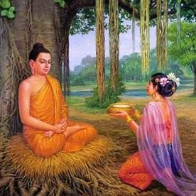 这时一位牧女见到他虚弱不堪,便熬乳糜(奶与谷物共煮而成)供养他。