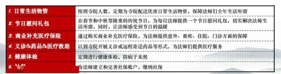 每一份医保及补充医疗保险,都力图用最实在的金额,涵盖到住院补贴、门诊报销等,让师父们看病再也无经济之忧。