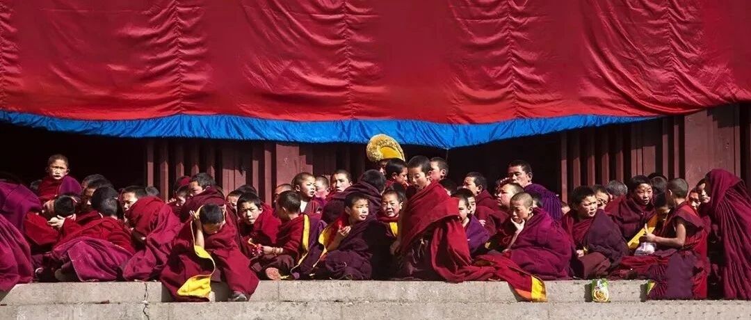 藏传佛教僧人的寺庙生活,是独具特色的。根据律经规定,小孩只有在到达能驱走乌鸦的年龄(大约7-8岁)时,方可出家。入寺时家人为孩子剃光头,只留下头顶上的一绺,由堪布亲自为其剃去,从此成为一名出家者。从剃度到二十岁之间,授沙弥戒。沙弥戒是出家人第一次受的戒,包括不偷盗、不杀生等33戒。授戒时,由于地区的差别,轨范师(阿梨)的人数不等,但不得少于五位。比丘戒是佛家大戒,共有253条戒律。授戒者必须年满20岁,且必须受过沙弥戒。与授沙弥戒一样,授戒时不得少于五位阿梨参加。茶是藏族饮食中不可缺少的一部分,在寺院里更是如此。每天早晨,僧人们参加早祷仪式。在领经师的主持下,众僧共同诵经。然后喝酥油茶、吃糌粑。中午僧人聚集在寺院的各所属“扎仓”(僧院)的经堂里,边喝茶边祈祷诵经,形式与早祷相同,但规模较小。到了晚上,僧人们聚在按所属地域划分的小组织“康村”内喝茶祷告,藏语称为“康恰”。刚入寺的学僧要学习藏语文基本知识,同时背诵一些简单的颂词及祷文。有一定文学基础后,始入“曲热”(法苑)学习佛教经典。△郎木寺学经的小喇嘛 学习是大多数人童年绕不开的噩梦,而这些小喇嘛对于带在寺里的日子倒是乐在其中。一般头三年要学习广、中、略三部摄类学(启明因明学),然后依次学习因明、般若、中观、俱舍、律经等五部大论。△郎木寺的小喇嘛 他们的生活其实很丰富,远不止在大山里奔跑打闹,看到陌生人的时候,会躲在门后笑。从学制上来说,一般有13级和15级两种。如拉萨三大寺中的色拉寺和甘丹寺分为13级,而哲蚌寺分为15级。总之,各扎仓(学经院)总体上学程要在10多年至20余年以上。学经过程中,既重学习,更重辩经。学员每天到“曲热”,或听上师讲经、或进行辩论。一人立宗,一人攻宗,你问我答,好不热闹。学僧通过一系列的诵经、学经、辩经活动之后,熟谙经典。此时方可参加所在寺的各级答辩会,通过考核者可逐渐参加拉萨大法会的辩经。· 一级:拉让巴格西,是在拉萨传昭大法会上通过辩论考取的;· 二级:措让巴格西,是藏历2月传小昭法会考取的;· 三级:多让巴格西,是在寺院内部进行答辩通过后获取;如果一个普通僧人想达到最高法座——甘丹赤巴(法台)位置,· 必须进入拉萨上下密宗院修习密宗,取得密宗“阿让巴”学位;· 担任一年或半年格贵,三年翁则、三年堪布,再转为堪苏;· 然后甘丹赤巴这个职位依次由夏孜和绛孜的候补人轮流交替递补担任;但达到此位的僧人几乎已到耄耋之年。可见佛学的深奥及获取学位的艰难。当然这份沉甸甸的绛红对于僧人来说,不只是看一个人的慧根,更取决于他前世今生的福报和修行。所以,并不是每一个人都能成为僧人,因为在每一抹绛红中,我们看到不只是此生短暂的修行,而是轮回中的因果。