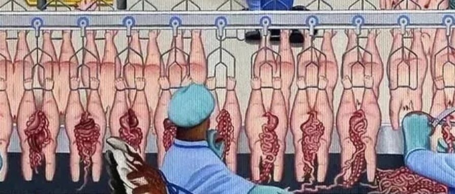 全画详细展现了整个过程,“盘中的肉,就是被这样生产出来的!”