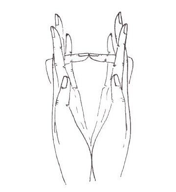 二手合掌拉开,手腕相靠,二手无名指向内弯曲90度,指尖相碰,其他指伸向上。