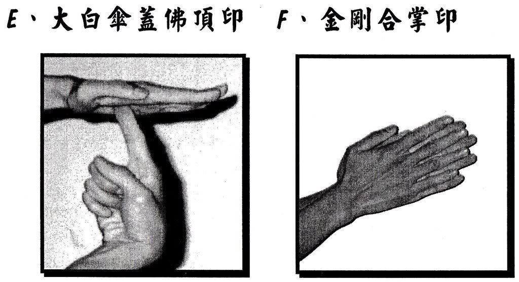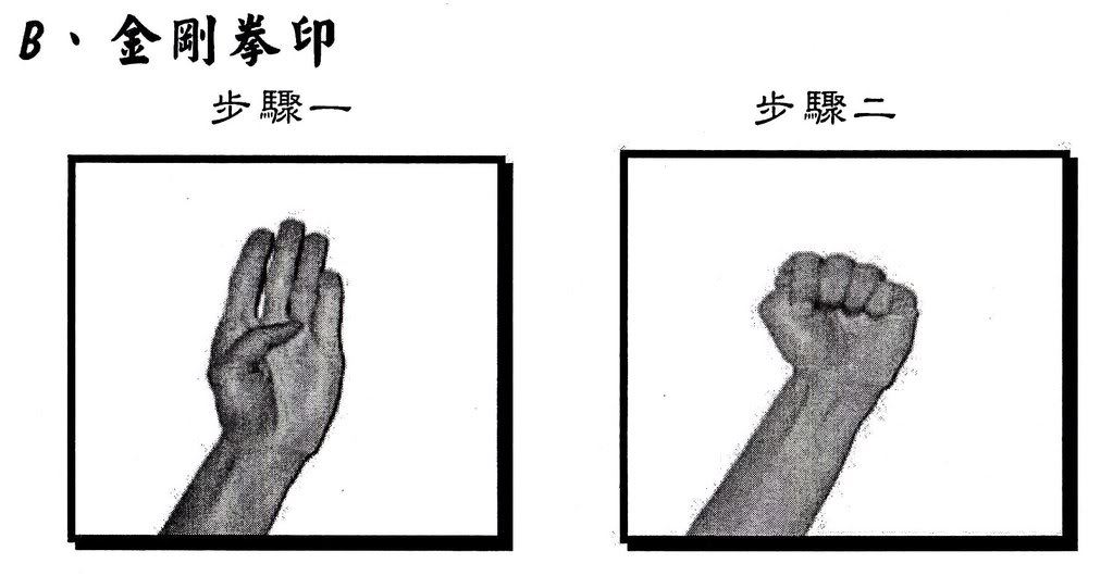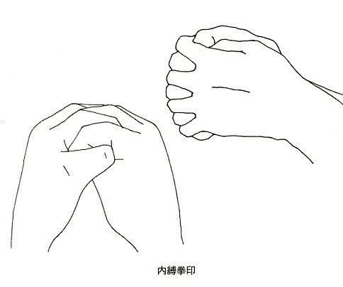 与外缚拳印相反,内缚拳则是手指于掌内交叉而握,形成一个拳的样子。而且手指重合与其他的印母一样,要右手在上。此印与刚才说的莲华拳一样是象征胎藏界的拳。也叫做二手拳、指向内向相叉拳、合拳、内掌权等。图为从横向看到的图和自己所看到的图。