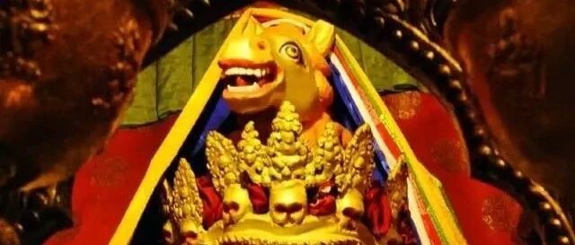 再说贡罗·仁青森格大师创建了“切巴扎仓”僧院以后,一直想请一位法力无边、神通广大的护法神,来护卫僧众的安宁和佛法的延续。刚好这个时候,父亲从后藏家乡,送来一尊祖传的、供奉了几百年的马头明王圣像,还有一柄古老的三棱金刚橛,这是马头明王无坚不摧的武器。
