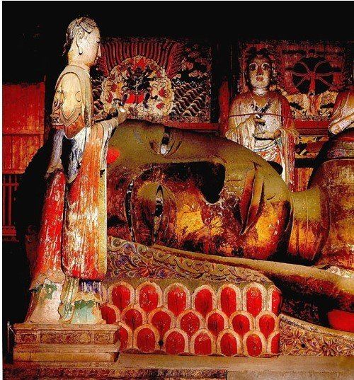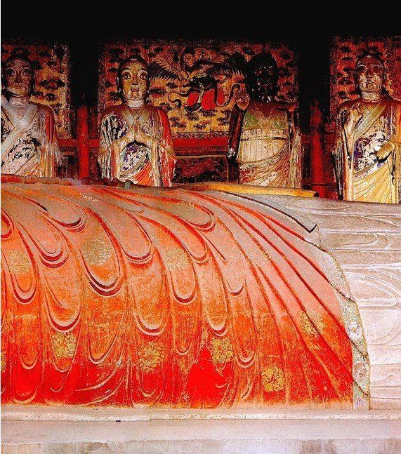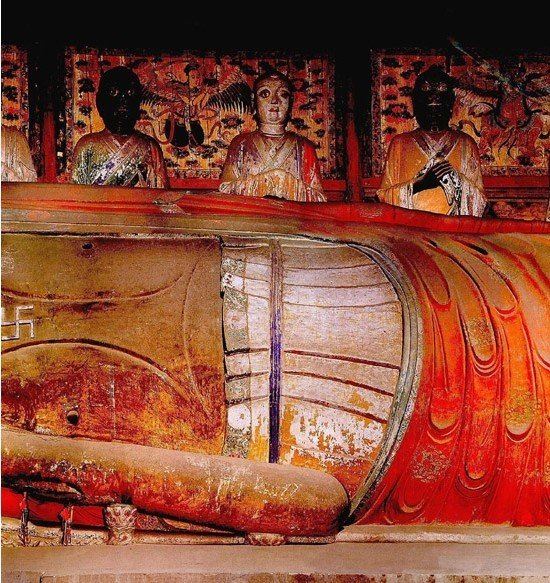 张掖大佛寺创于西夏,建于前明,上下数百年;“视之若醒,呼之则寐,卧游三千世界,方知此梦是真空。”这是对张掖大佛寺悠久历史的阐释,也是对佛祖释迦牟尼涅盘入定的真实写照。在大殿正中1.2米高的佛坛之上,卧佛安然酣睡,佛身长34.5米,肩宽7.5米,耳朵约4米,脚长5.2米。造像木胎泥塑,金妆彩绘,面庞贴金,头枕莲台,面西侧身而卧,双眼半闭,嘴唇微启,造像丰满端秀,姿态怡静安详。胸前饰斗大“卍”字符号,梵文寓意“吉祥海云相”。卧佛首足处塑大梵天、帝释天立像各一尊,女身云髻高挽,彩带飘扬;男像面目威严,峨冠博带。背面为十大弟子举哀像,殿南北两侧塑十八罗汉群像。整组造像造型精美,比例协调,线条流畅,神态自然,端庄祥和,栩栩如生。