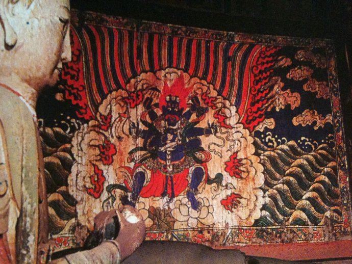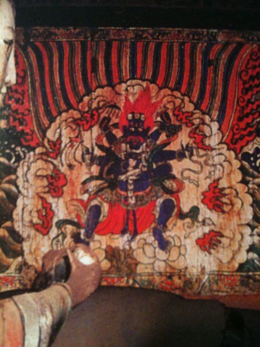卧佛的头像上方壁板上绘有一尊蓝色一面六臂的金刚,此像通身靛蓝色,红色须发上竖,头顶五骷髅冠,双腿左弓右伸,两足各踏白莲,周身金刚烈焰外如云气,顶上虹光冲天,四下又波浪滔滔;细观其手,左上手持一宝瓶,左中手以期克印持一龙蛇,右上手擎一宝伞,右下手握一带幡状穗的宝剑,二中手当胸持一宝珠——此像颇具藏密风格,因大佛寺乃西夏所建,后于明代重修,加之地处丝绸之路河西走廊,自然是融合各种教法之地——西夏及元代盛行藏密,故造像拥有藏密风格本不足为奇,而此像为唯一护持涅盘际之佛陀,则又不能不让人想到——莫非此金刚绘的就是秽迹金刚?