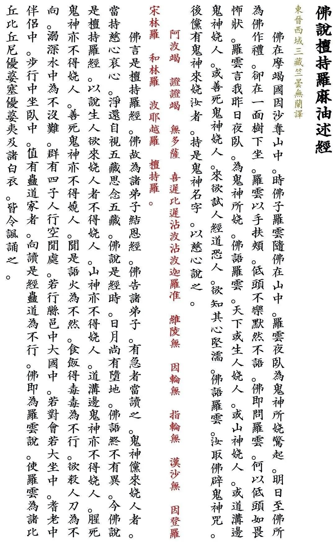 佛说摩尼罗亶经 东晋西域三藏竺昙无兰译 闻如是。一时佛在舍卫国只树给孤独园。时与摩诃比丘僧。说『摩尼罗亶经』。佛问阿难言。天下人民得不安隐用何等故。用天下万民多有疾病者病痛者用何等故。用出母腹痛用伤心痛头痛目眩不能饮食。魔皆所为。 今诸比丘大惧怖如是。便前白佛言。痛从何所来去至何所。人民大愁忧不乐。佛会诸比丘摩诃迦叶惟阿那律离越摩诃目犍连舍利弗阿难因持罗。 佛便说『摩尼罗亶经』。佛便举诸佛名字。第一惟卫佛。第二式佛。第三随叶佛。第四拘留秦佛。第五拘那含牟尼佛。第六迦叶佛。第七释迦文佛。 今是经皆从诸佛口中出。第一式叉罗。第二揵陀罗。第三揵头罗。第四弥佉罗。第五干朱罗。第六摩油罗。第七阿须轮。第八随沙门。第九随孙。第十[阿-可+曼]提。 都卢大小一切人民有得疾病者。今佛令诸比丘僧比丘尼优婆塞优婆夷。皆当说是经。 有国中鬼。有山中鬼。有林中鬼。有草暮鬼。有冢间鬼。有冢中鬼。有地上鬼。有水中鬼。有水边鬼。有火中鬼。有火边鬼。有北斗鬼。有虚空中鬼。有市井鬼。有死人鬼。有生人鬼。有饥饿鬼。有道外鬼。有道中鬼。有堂外鬼。有堂中鬼。有身中鬼。有身外鬼。有饭食鬼。有卧时鬼。今佛言。有赤色鬼。有黑色鬼。有长鬼。有短鬼。有大鬼。有小鬼。有中适鬼。有白色鬼。有黄色鬼。有青色鬼。有黑色鬼。有梦寤鬼。有朝起鬼。有步行鬼。有飞行鬼。有问人魂魄鬼。有生人鬼。有死人鬼。 佛言若有嗔恚刀杖起时。皆当念是『摩尼罗亶经』。诸鬼神则为破碎。 佛告诸比丘。若有受是经者。若有病瘦。当说是经。若有头痛目眩寒热伤心。常当读是『摩尼罗亶经』。诸鬼神则头破作七分。 若有县官盗贼水火。则当读是『摩尼罗亶经』。诸鬼神不得复娆害人。 今是经诸佛口中所出。若有国中鬼。一者名深沙。二者名浮丘。是二鬼健行求人长短。若有头痛目眩寒热伤心。即当举是二鬼名字。便当说『摩尼罗亶经』。是诸鬼神无不破碎者。 若有青色鬼。黄色鬼。黑色鬼。高大鬼。卑小鬼。广长鬼。一切大小诸鬼神。喜娆天下人民者。其鬼名:金曼鬼。薛荔鬼。饥饿鬼。悭贪鬼。勤苦鬼。病瘦鬼。有痛痒鬼。有思想鬼。身中鬼。身外鬼。形残鬼。跛踺鬼。痛狂鬼。痴聋鬼。喑哑鬼。呻吟鬼。啼哭鬼。闲病鬼。虚耗鬼。嫉妒鬼。魍魉鬼。荧惑鬼。游光鬼。镇厌鬼。咒咀鬼。伏尸注鬼。癞死注鬼。官舍注鬼。军营鬼。亭传鬼。狱死鬼。囚死鬼。水死鬼。溺死鬼。火死鬼。烧死鬼。客死未葬鬼。市死鬼。道路死鬼。渴死鬼。饿死鬼。喝死鬼。冻死鬼。兵死鬼。血死鬼。腥死鬼。逋祷死鬼。斗死鬼。棒死鬼。绞死鬼。自悬死鬼。自刺死鬼。怨家死鬼。强死鬼。腐皮鬼。断人毛发鬼。饮人血鬼。飞行鬼。骑乘鬼。驾车鬼。步行鬼。逢忤鬼。山神鬼。石神鬼。土神鬼。海边鬼。海中鬼。桥梁鬼。沟渠鬼。道中鬼。道外鬼。胡夷鬼。羌虏鬼。树木精魅鬼。百虫精魅鬼。鸟兽精魅鬼。溪谷鬼。门中鬼。门外鬼。户中鬼。户外鬼。井窖鬼。污池鬼。溷神鬼。方道鬼。蛊道鬼。不臣属鬼。诈称鬼。 一切大小诸鬼神。皆不得娆害其身。鬼神不随我言者。头破作七分。 若人得病瘦者。当举是上诸鬼神名字。咒病瘦者。即得除差。是经释迦文佛口中所出。诸鬼神闻是经。从今已后悉破解愈。佛说经已。诸比丘比丘尼优婆塞优婆夷诸天龙鬼神人民皆受佛恩前为佛作礼而去。