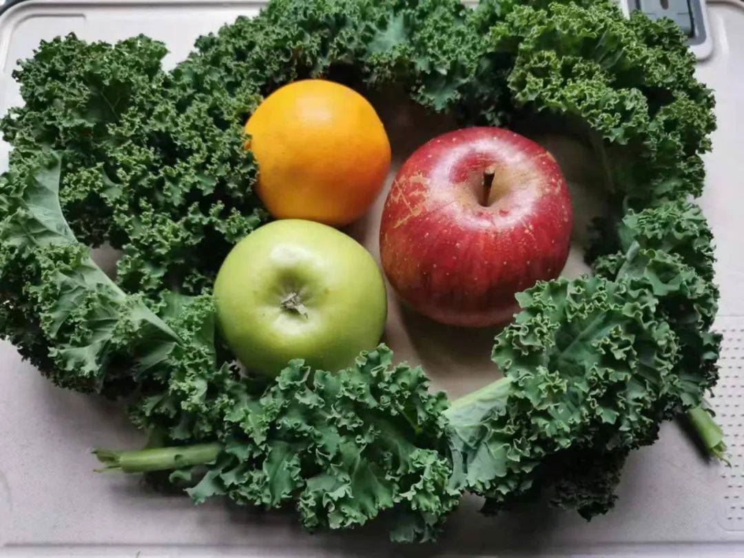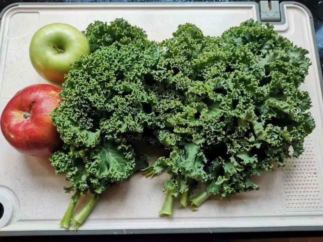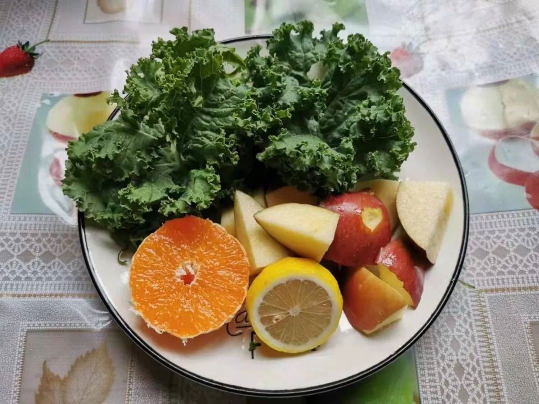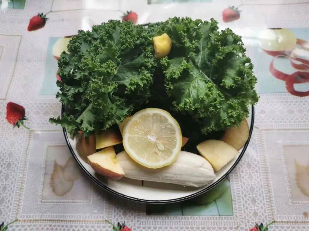 某日早餐,鲜花与牛粪的故事,羽衣甘蓝,青苹果,红苹果,褚橙,柠檬,生姜粉。