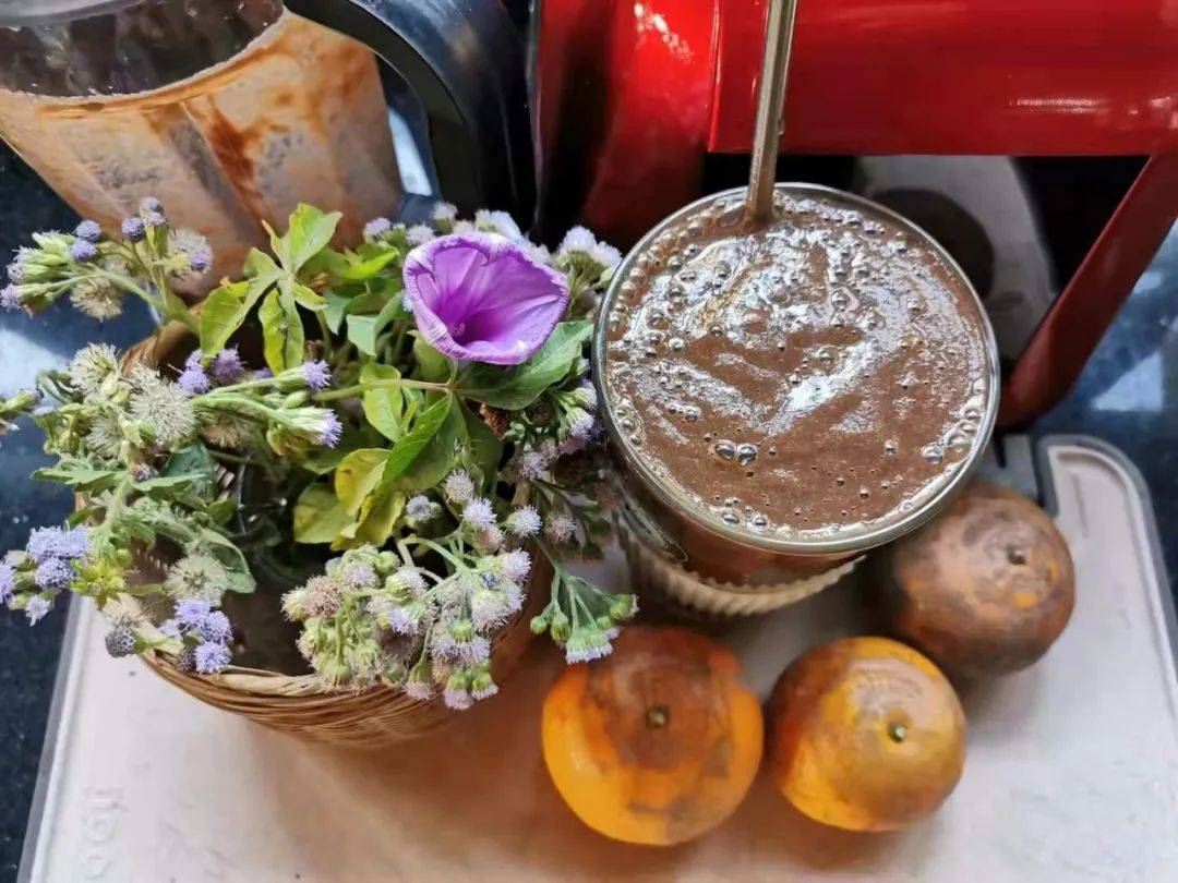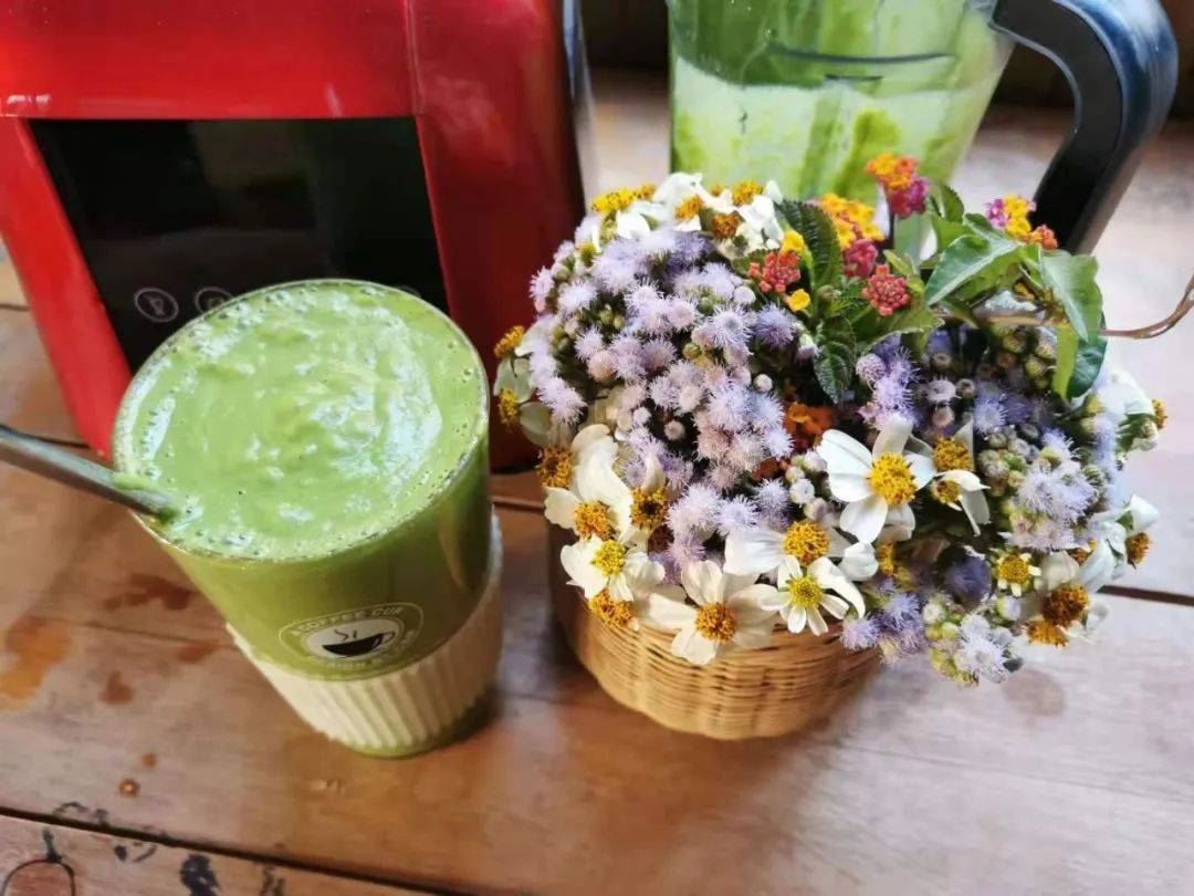 他还采来鲜花,又给自己的果蔬昔命一个美美名字,美美的色彩令他心情愉悦,喜生阳。