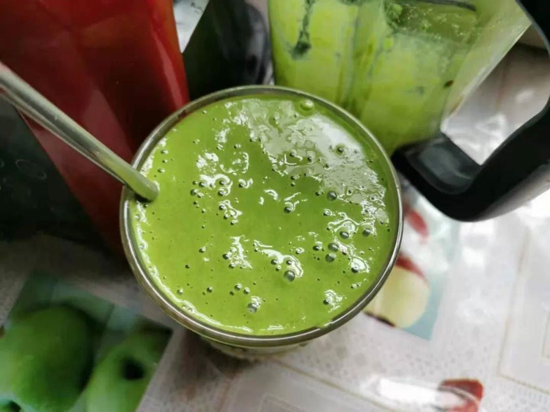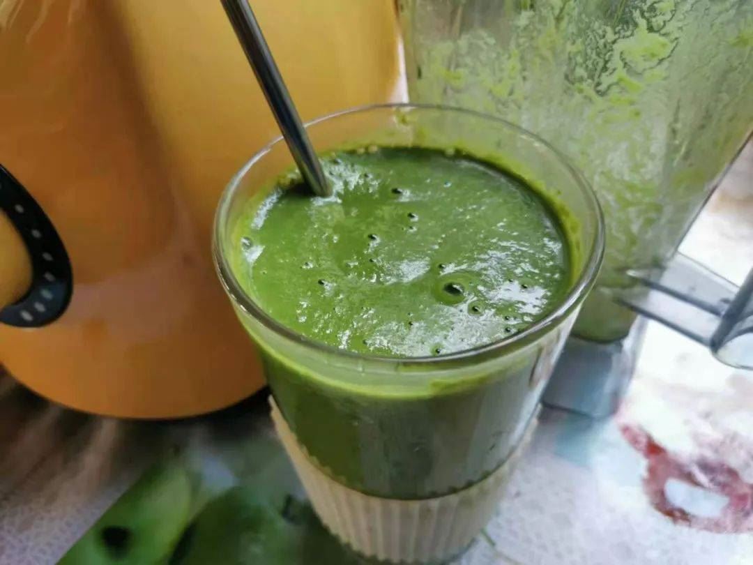 某日早餐,从田野到餐桌的生命绿洲果蔬饮,羽衣甘蓝,米蕉,苹果,柠檬,生姜,亚麻籽。