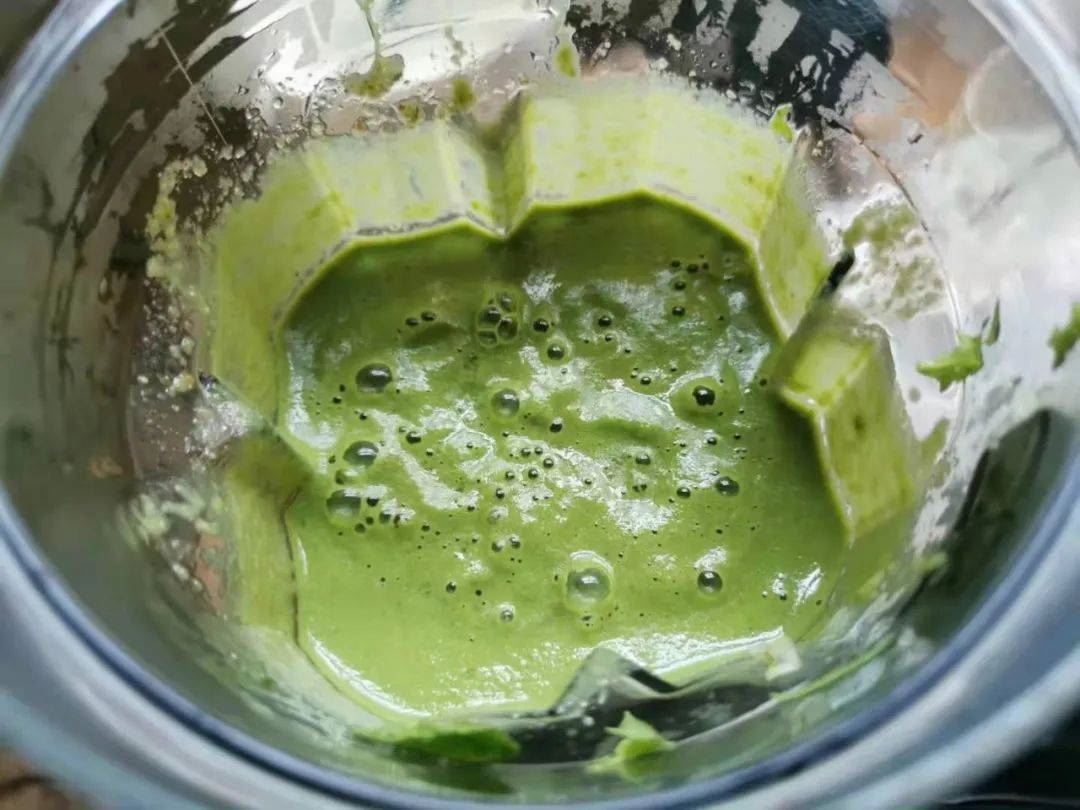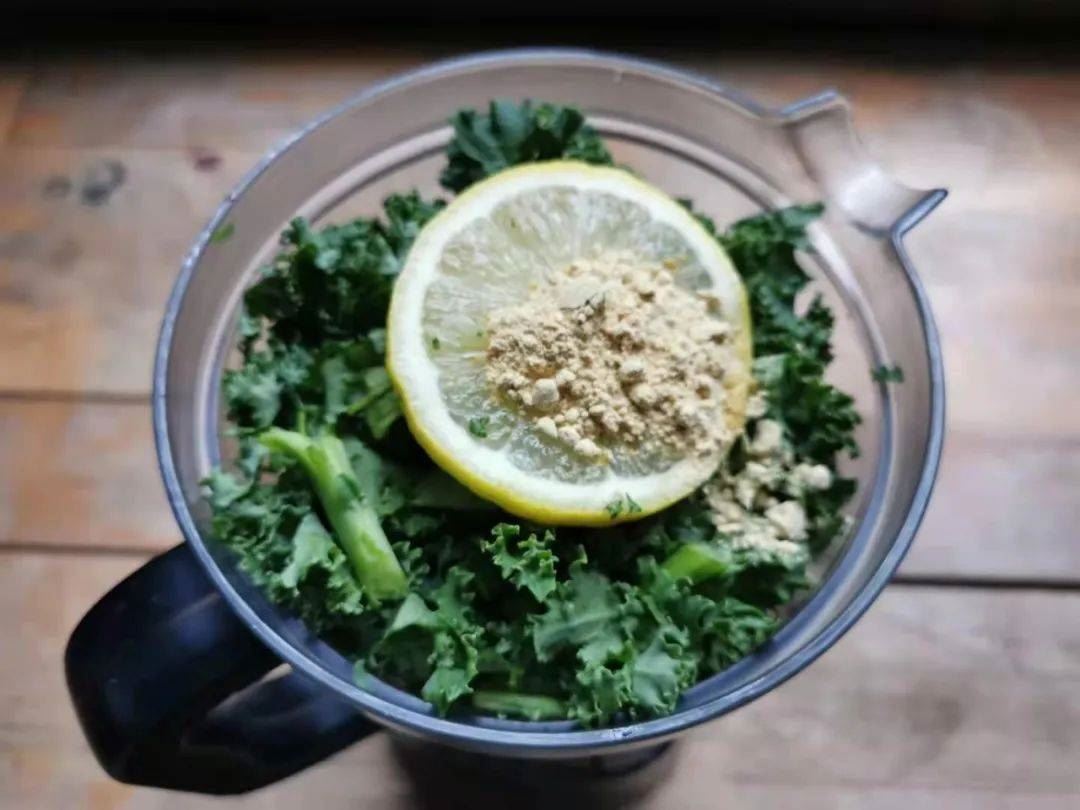 某日早餐,生命绿洲果蔬饮,羽衣甘蓝,苹果,柠檬,小黄姜,亚麻籽。