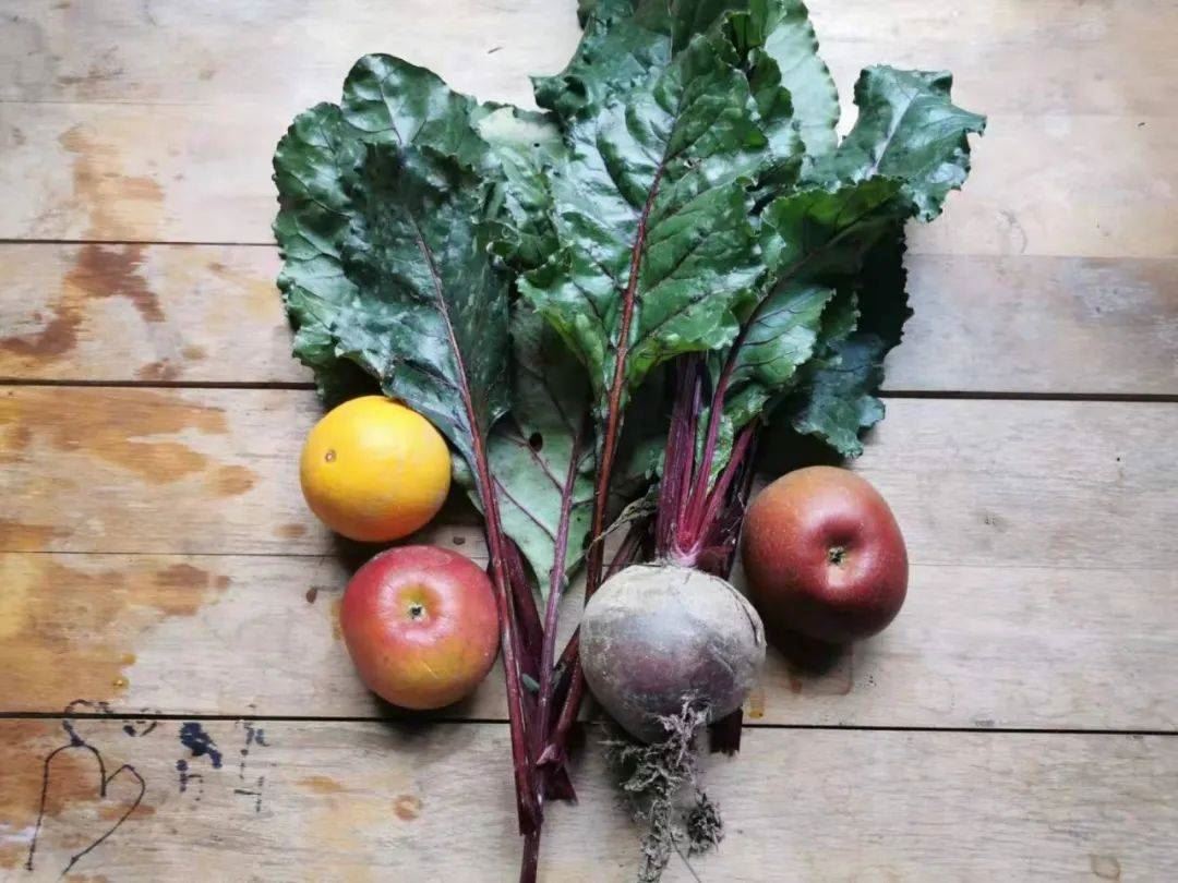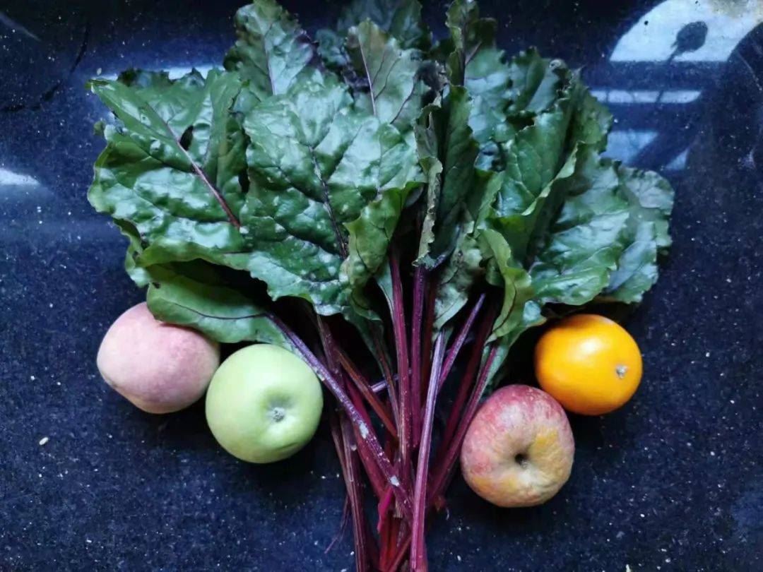 某日早餐,甜菜根茎叶蔬果昔,红苹果,甜菜根茎叶,褚橙,生姜。