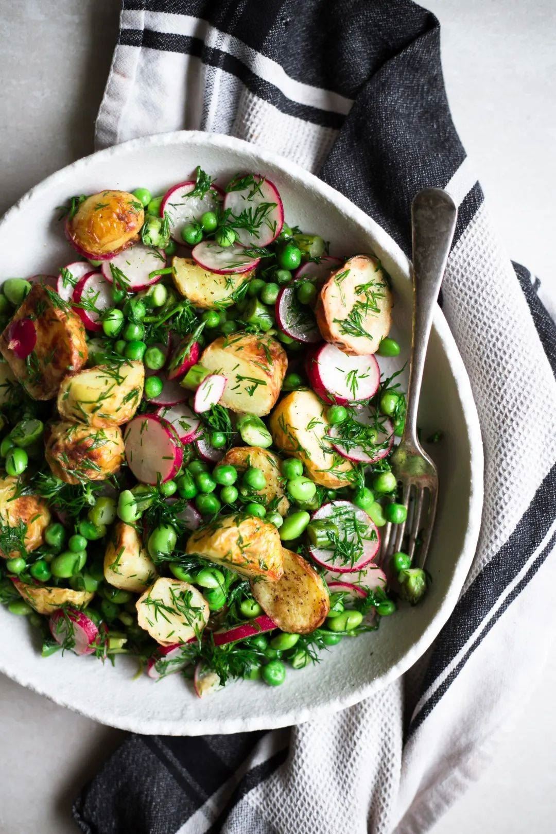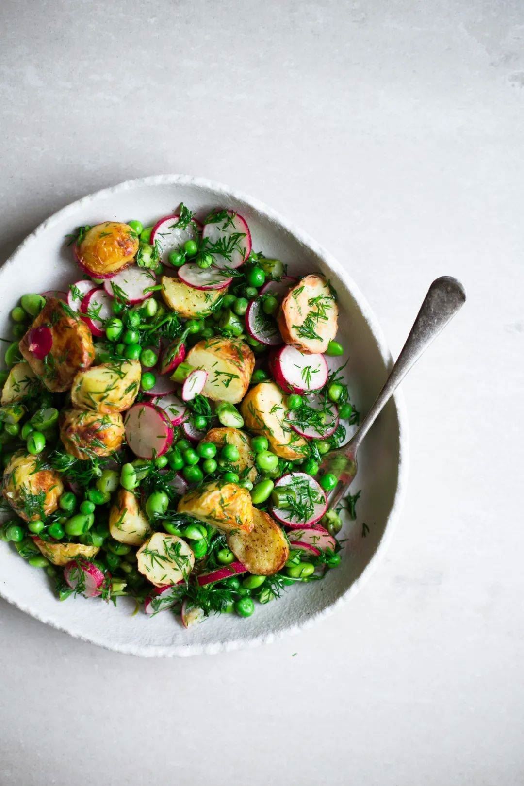 6.在一个大碗里,混合烤土豆,芦笋,豌豆和毛豆,拌入萝卜片。