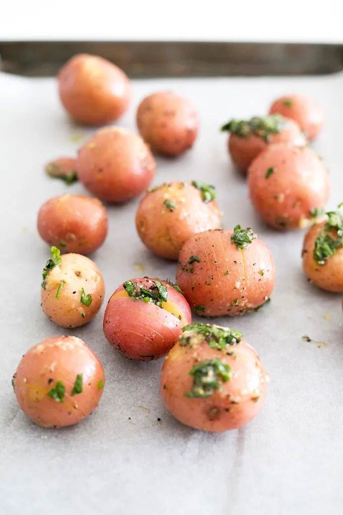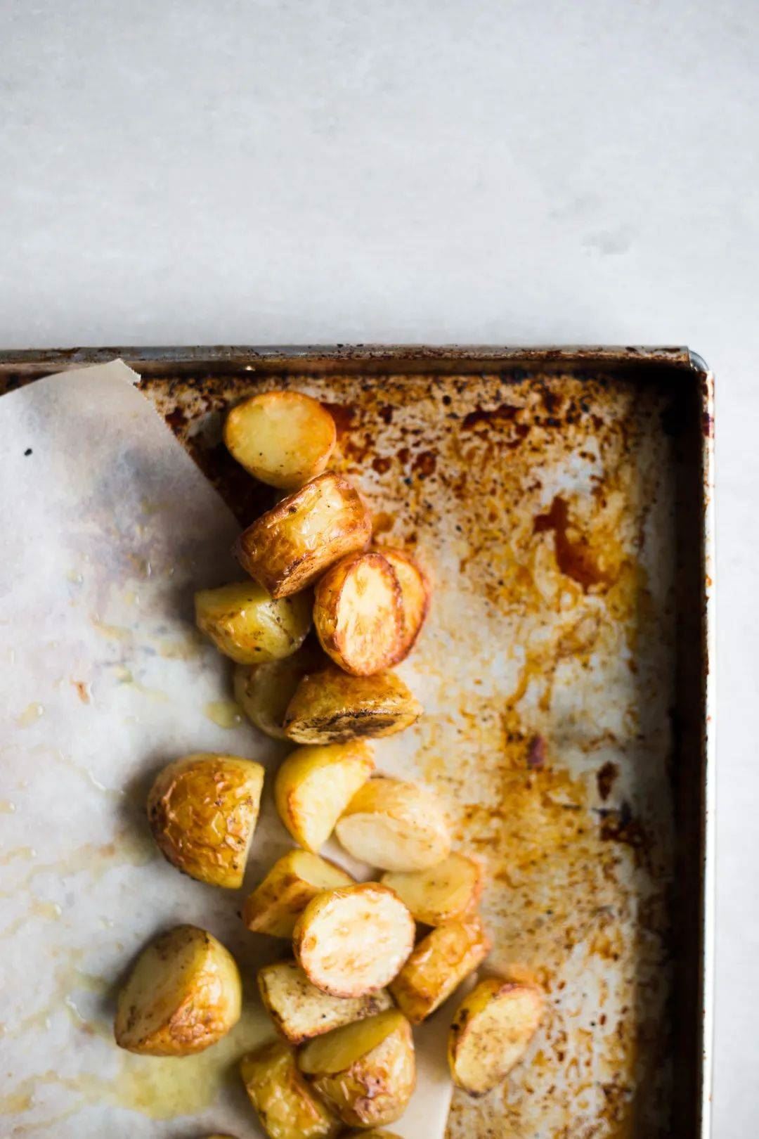 6.烤25分钟后,将一半的柠檬香草橄榄油混合物涂在土豆上,然后放回烤箱,继续烤25分钟或直到土豆熟。