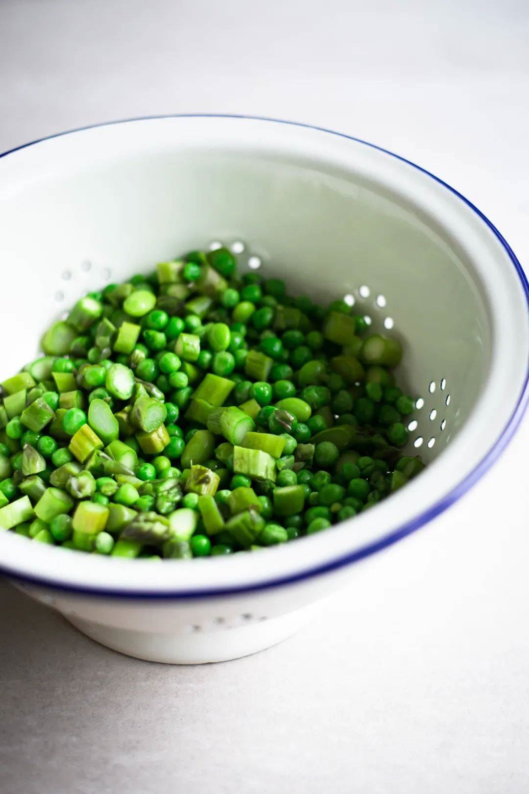 4.同时,烧一壶水。将芦笋片、豌豆和毛豆焯水5分钟。蔬菜煮熟后,将水沥干备用。