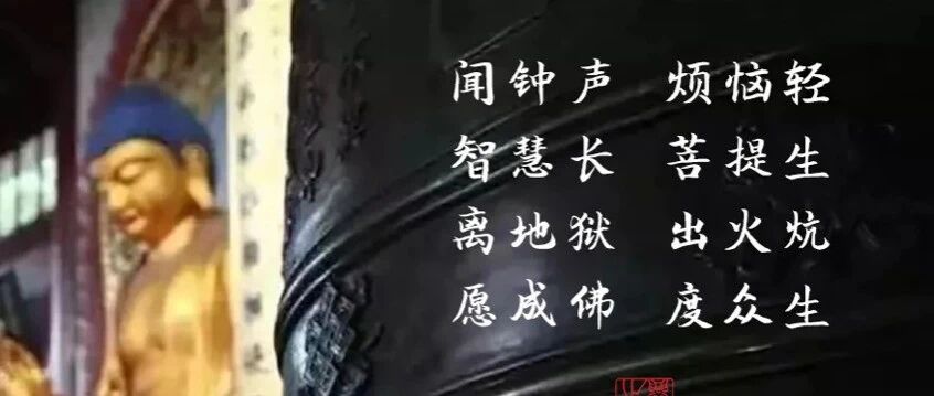 所以,大凡具有感染力的钟声,都是由形大体重、钟唇厚而外张的青铜钟发出的。敲钟时,可别忘了耳闻心诵:“闻钟声,烦恼轻,智慧长,菩提生,离地狱,出火炕,愿成佛,度众生。”如此发心,福慧双修,功德无量。