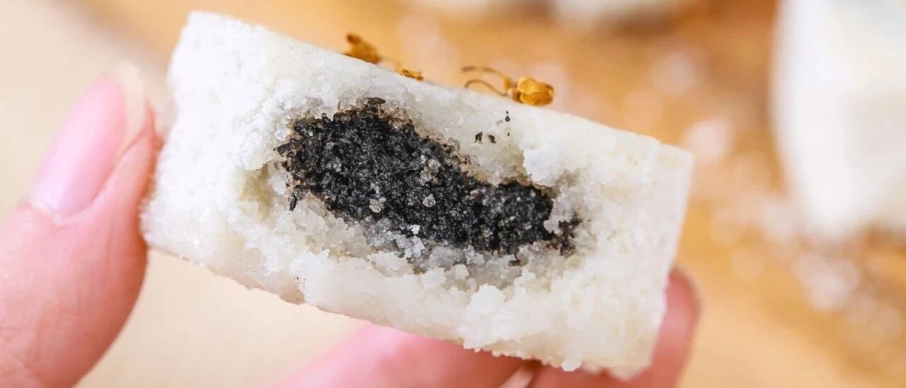 将黑芝麻馅放入坑里(馅除了黑芝麻馅,也可以是豆沙馅)