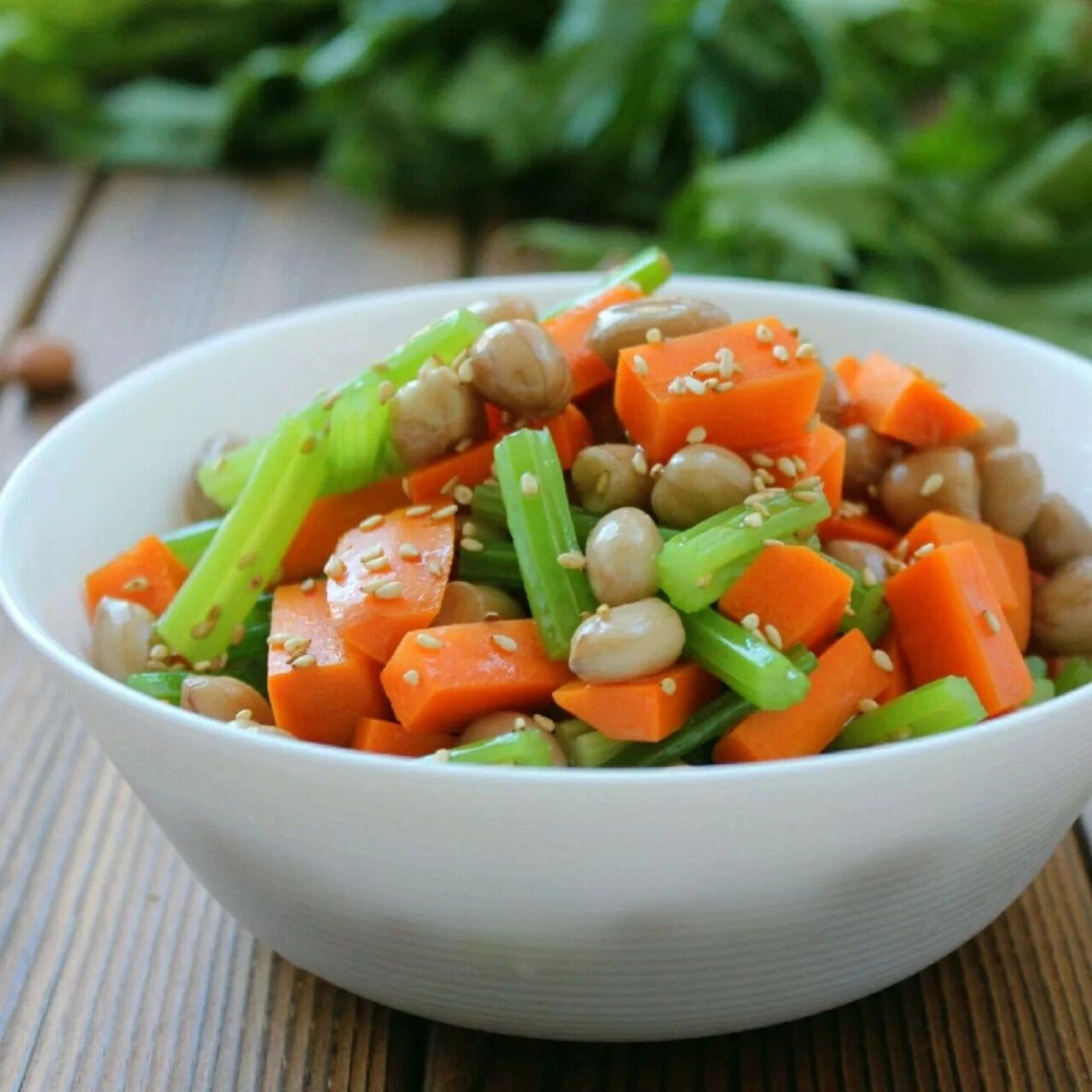 花生米200克,芹菜2根,胡萝卜1根,姜片适量,八角2个,花椒一小把,盐适量,香油少许,白芝麻、蔬果粉适量
