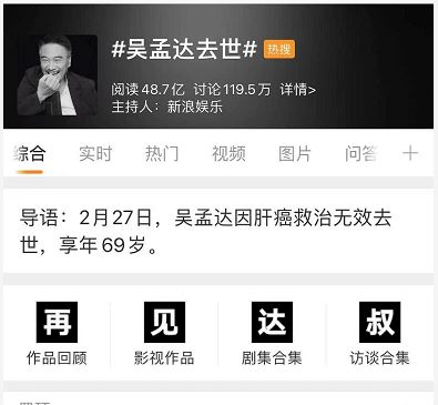 2月27日,着名香港演员吴孟达因肝癌去世,其发言人称,“达叔走得很安详”。