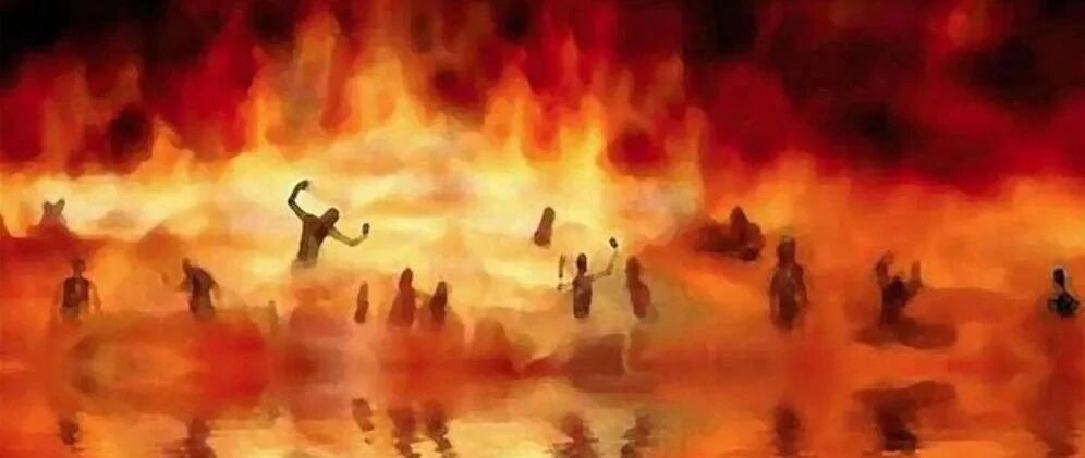 阎罗法王就召一个冥官把老婆婆带到地狱的业海里面去,只看见业海的边上,有上千个生前是捕鱼的罪人,都被铁绳捆住勒紧了脖子,杻械枷鍱,缠络其身,从空中有大火轮掉下来,掉到罪人的头顶,火轮钻入身体刹那烧尽,暂时死生三十余返,死了又活,活了又死,各各叫唤道:痛哉,痛哉,痛啊,痛啊,我们以前随便杀鱼,现在受到大苦报了啊!