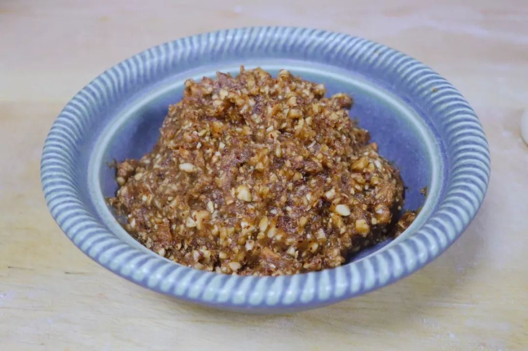 馅料的制作力求保留食物的原味,颇有种大道至简的意味。将红枣煮烂后去壳,与捣好的腰果碎拌在一起。不用另外加糖,采用红枣天然的味道,才能真正做到甜而不腻。