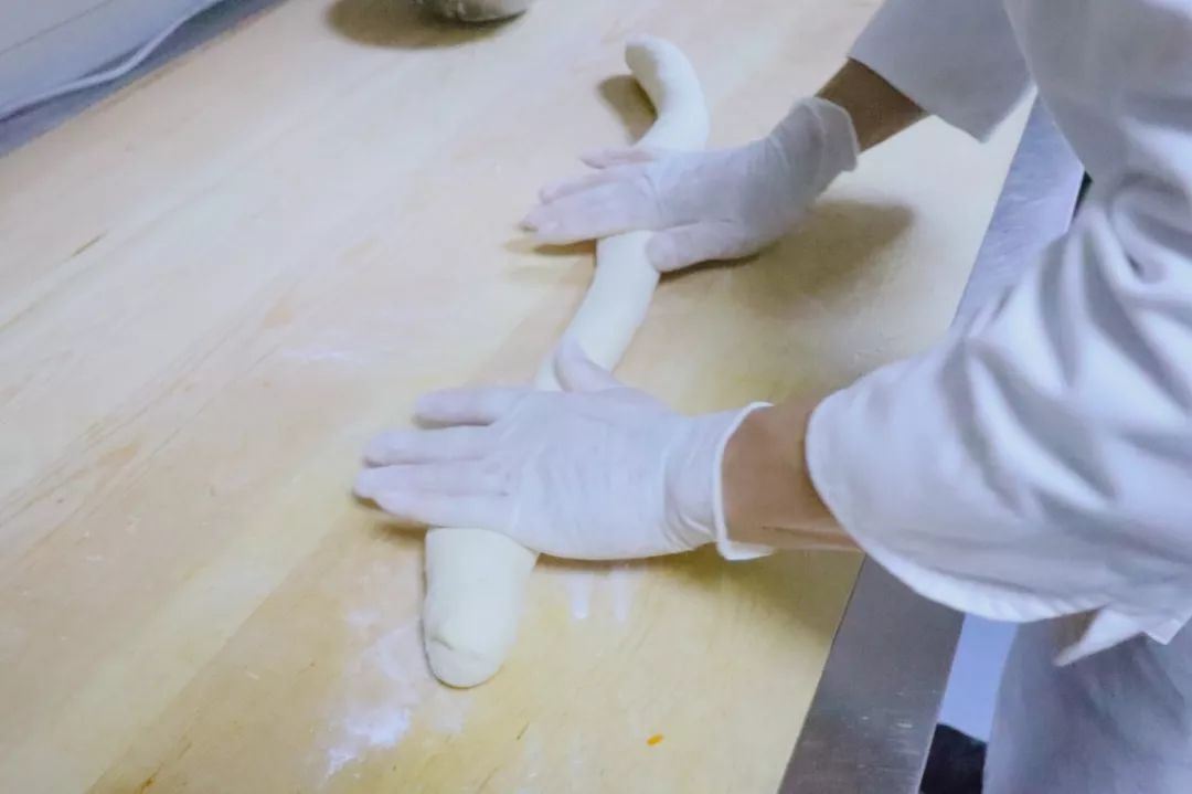 将面团放置到案板上,继续揉搓,拆面。此时的骆老师如同一位太极高手,双手运功,面团便是整个阴阳世界。经过反复折叠,用力打磨过的面团仿佛也融入了面点师的力气,变得筋道缠绵。