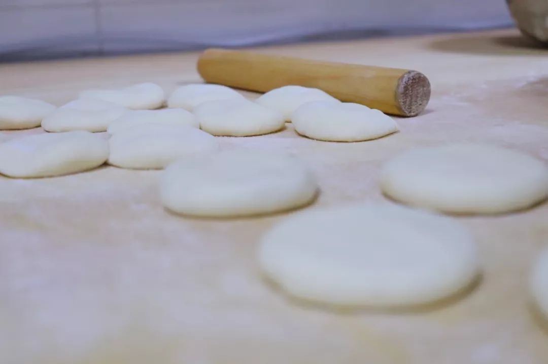 将小剂子擀成中间厚边缘薄的饺子皮状,不要太薄。只见骆老师手指翻飞,一个个圆皮像雪花一样顷刻间从手掌飞出。