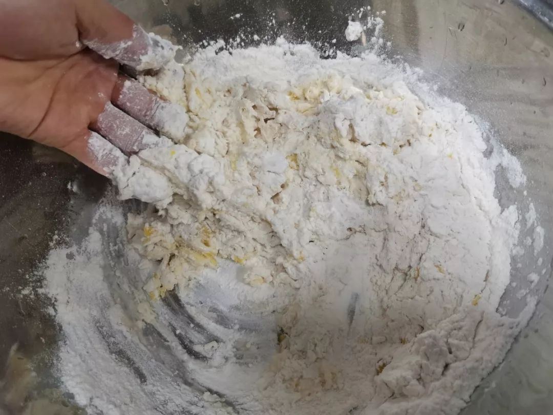 慢慢将面团揉成竹子粗细,手臂长短的圆柱形长条,用手揪成小剂,压扁,撒上面粉,防止粘在一起。