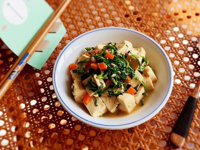 1. 豆腐切1.5cm方块,淡盐水浸泡15分钟,荠菜摘洗干净,胡萝卜切小丁,姜切粒;