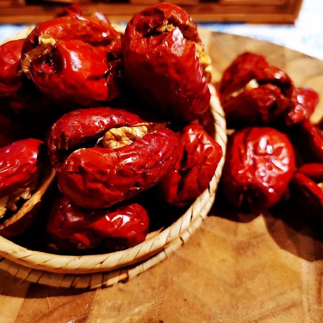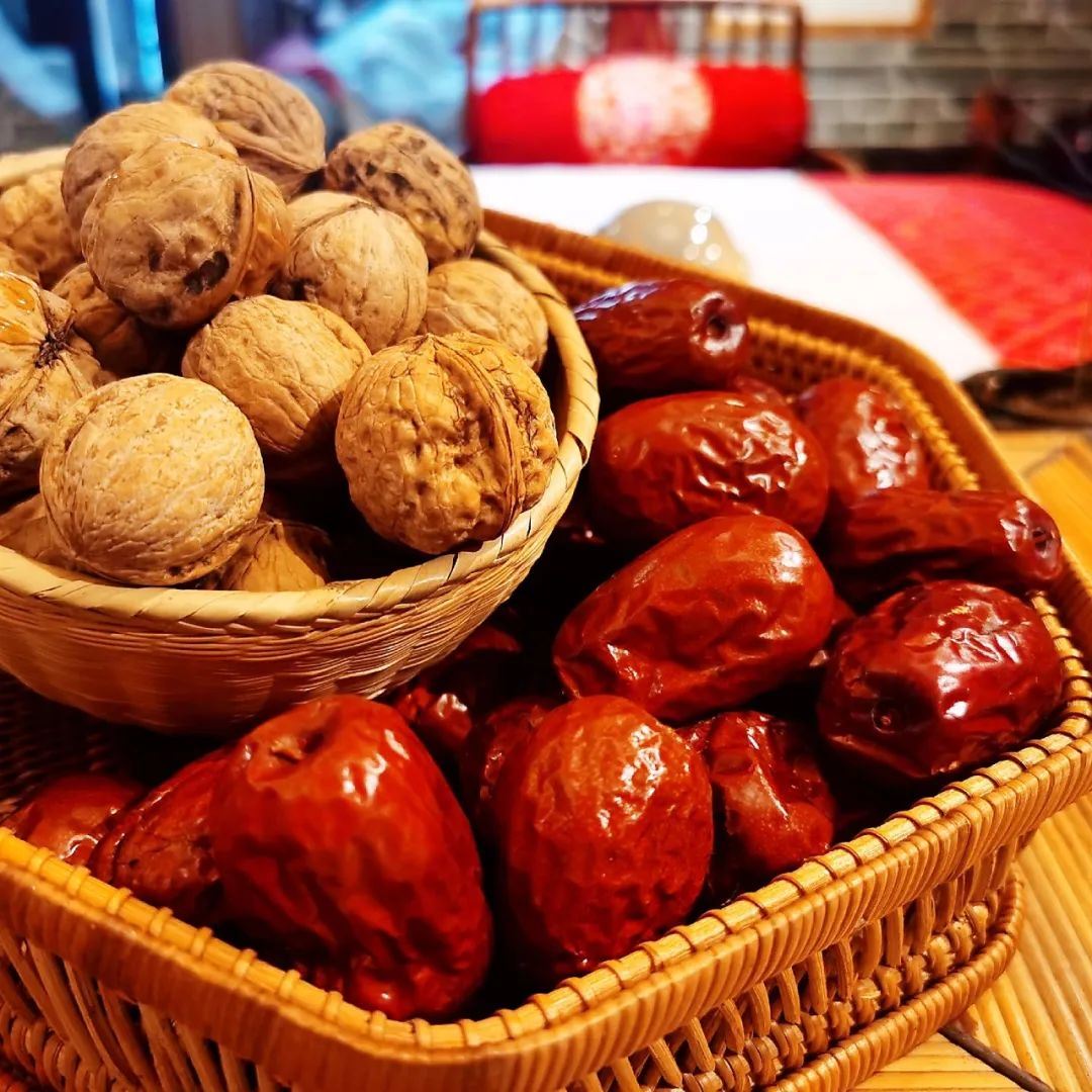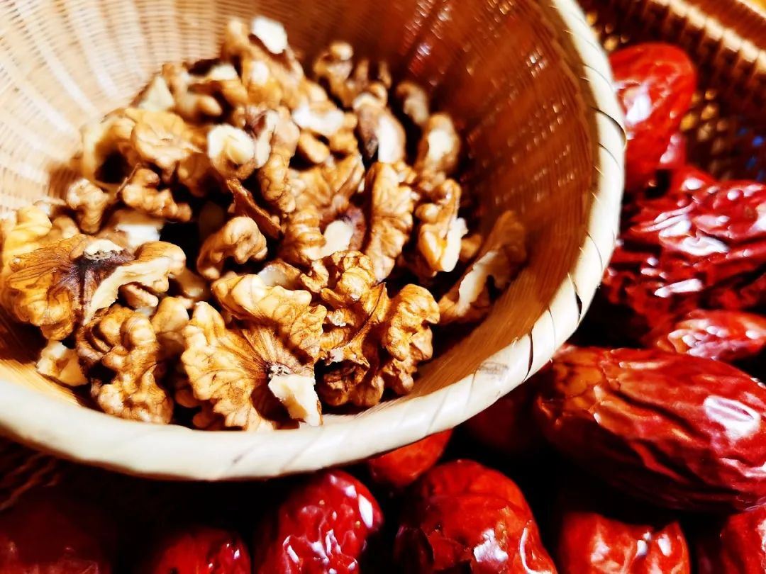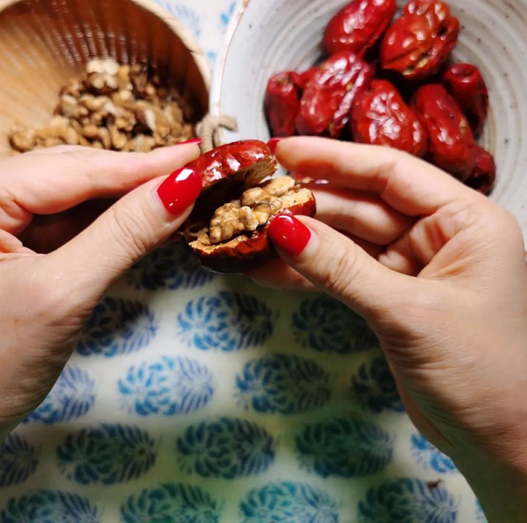 选购时尽量不要买特别雪白光滑的核桃,这种核桃多进行过化学处理,而表皮看起来粗糙有些瑕疵的核桃反而更加香醇健康,大枣选用的是和田大枣。