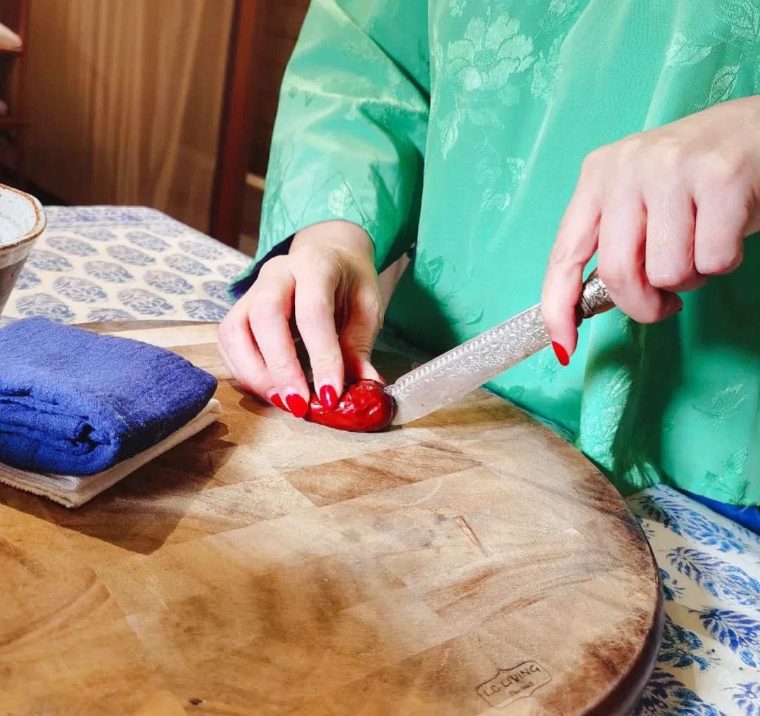 核桃用擀面杖敲破去皮,尽量不要弄太碎;大枣用刀从中间切开,不要切断,枣核去除后仍然是一个整体。