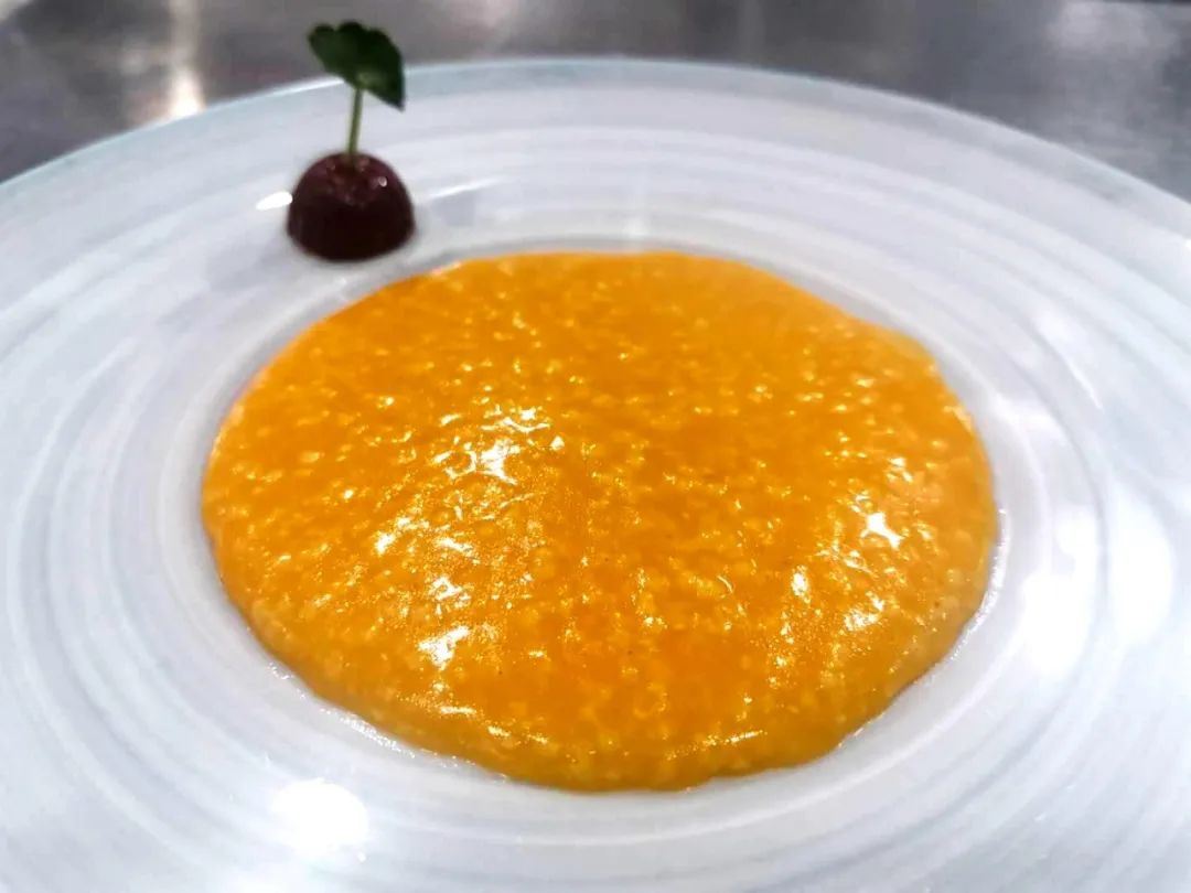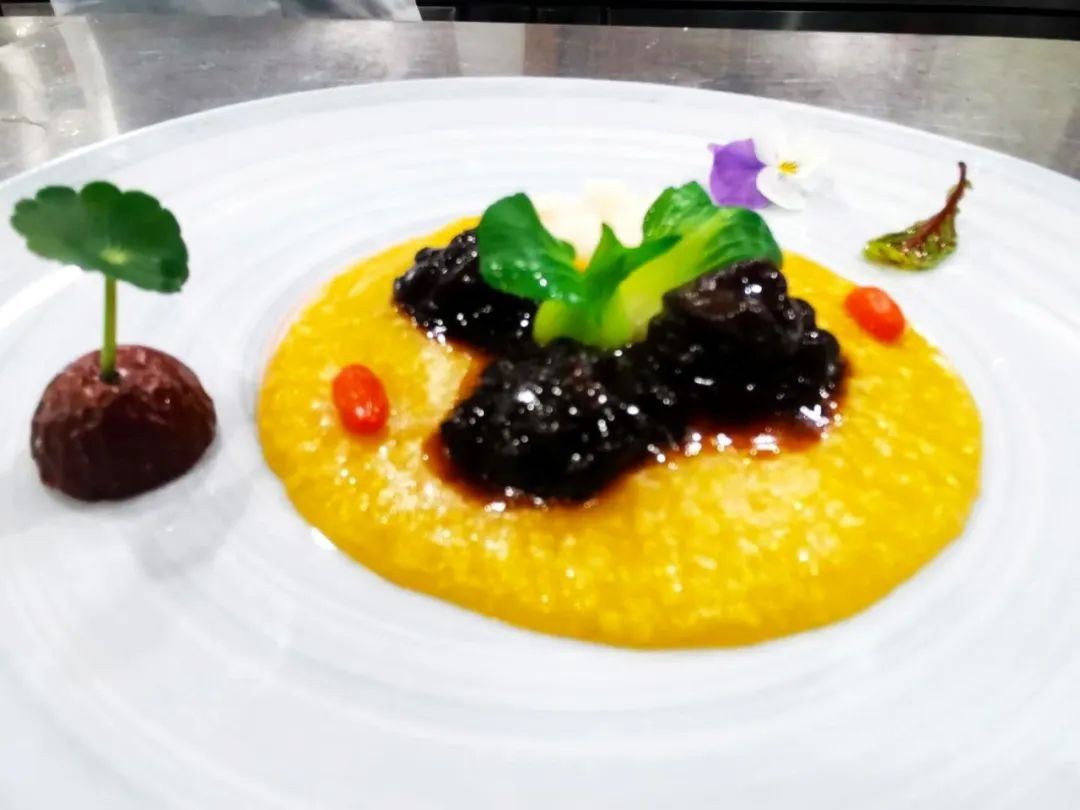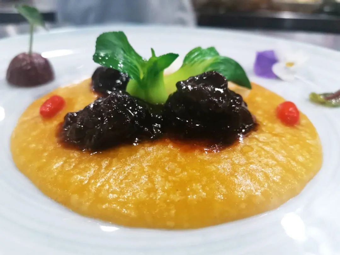 用筷子将煨熟的核桃菌夹出轻轻码放在小米金瓜粥上,“佛渡金沙”正式完成。