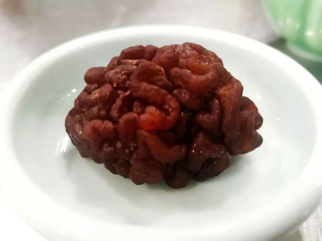 小米粥粘稠金黄,颗颗分明,如同沙粒。核桃菌如同有着黑丝发髻的释迦摩尼,端坐金色莲花台上,金黄色的小米粥波光粼粼。