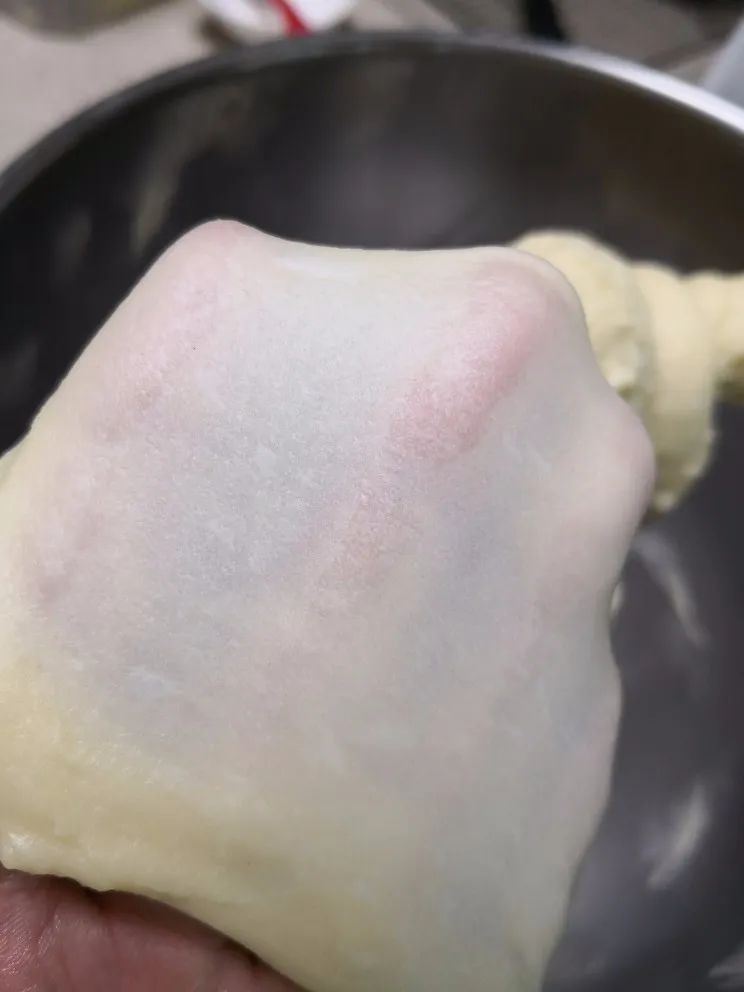 3.发酵好后再此揉搓发酵,共发酵三次,使气孔均匀,直到最后面皮光滑有弹性,可以拉成薄膜状即可;