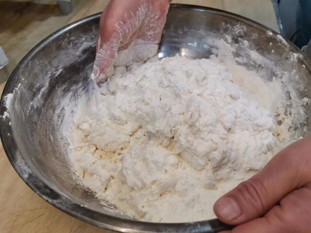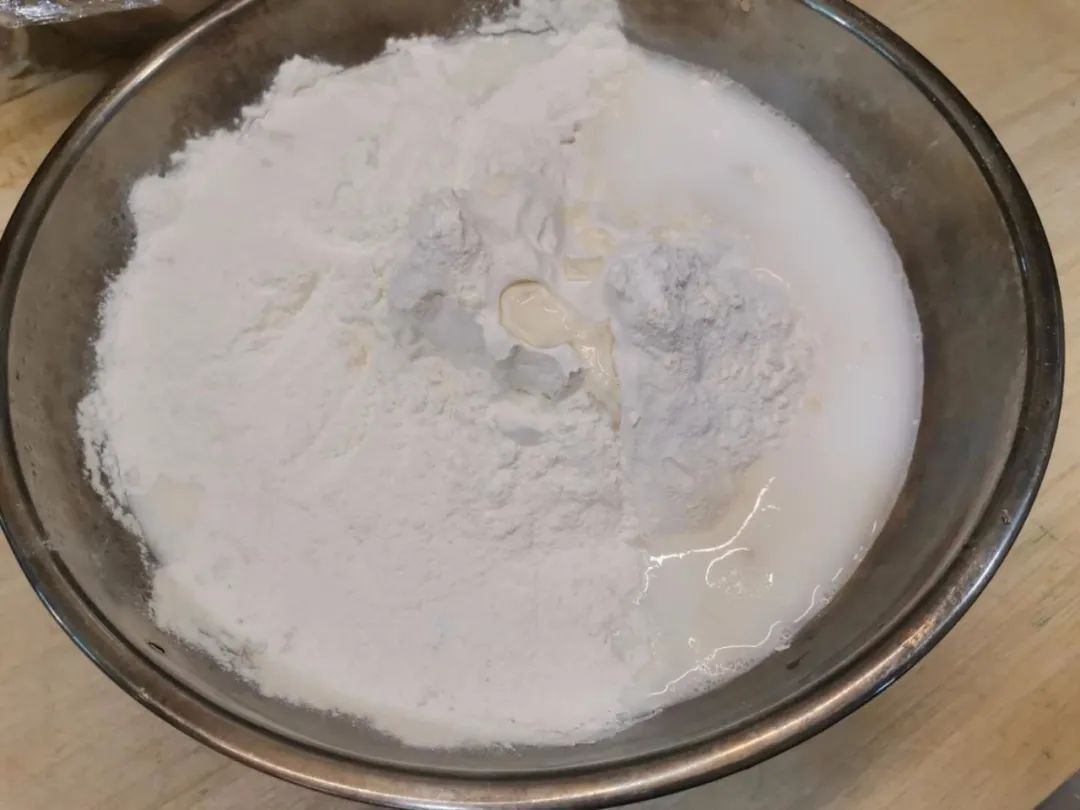 1.将面盆中倒入面粉,加入老发面、白糖、少许白酒、清水后和面;