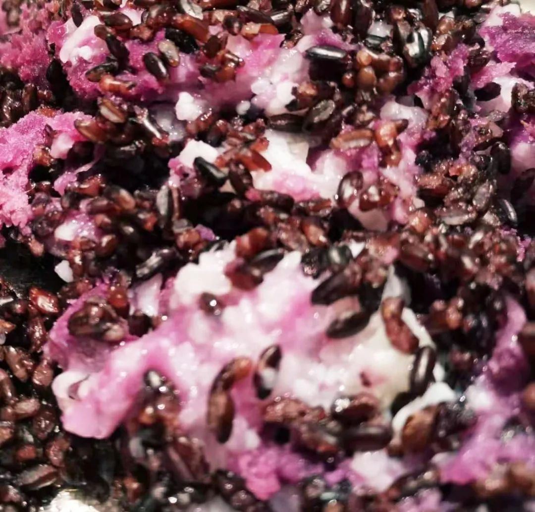 4.将紫薯洗净蒸熟,剥皮,捣成紫薯泥;把紫薯泥中加入糯米、紫米、糖桂花、油搅拌;再加入蔓越莓干、葡萄干、红枣丁、干果、红豆馅搅拌均匀。