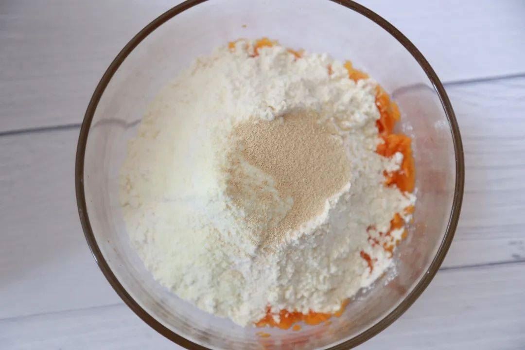 ③然后在胡萝卜泥中加入面粉、白砂糖和干酵母,用筷子大致混合均匀。