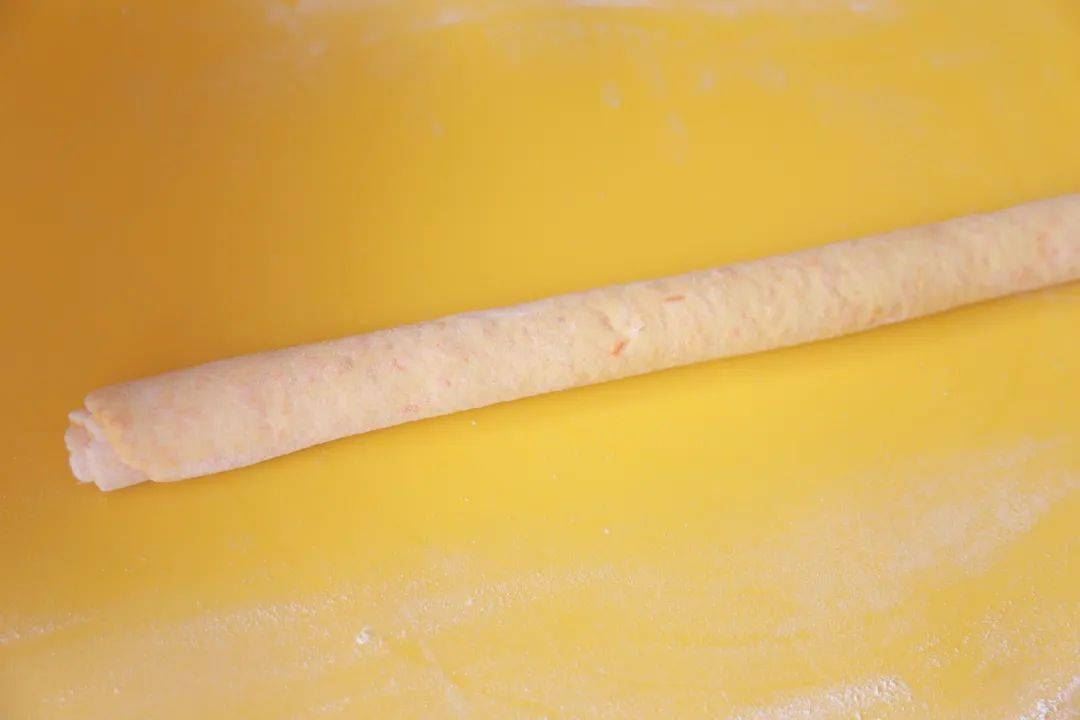 ⑦面皮擀好后,从一端的长边开始,向另一端卷起来,卷成圆柱状。