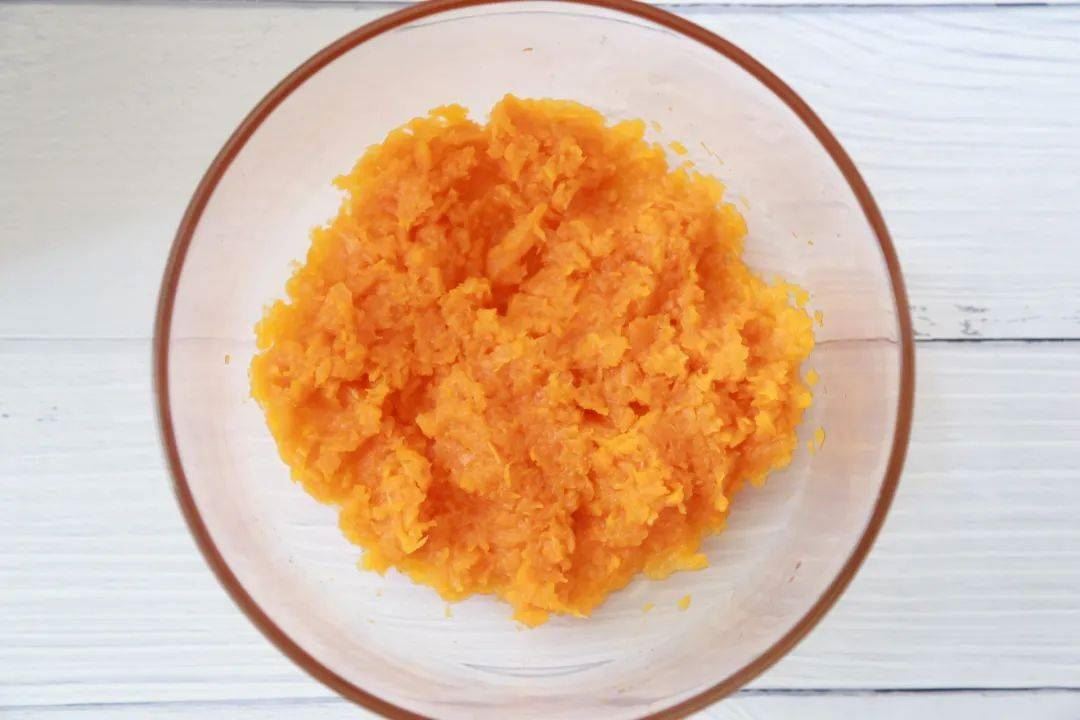 ② 胡萝卜蒸熟后装入一个稍微大点的碗中,然后用擀面杖将其捣成泥状,如果有料理机的话也可以用料理机打碎。