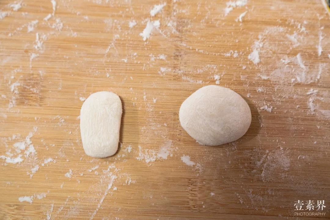 包饺子时,小面团必须要顺着横切面按压,不然擀出来的形状会不圆。
