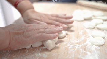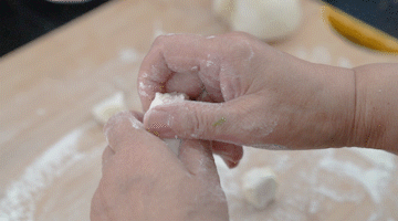取出醒好的面团,分成小团,用手拉长揉圆后,揪成一个个大拇指大小的小团块。