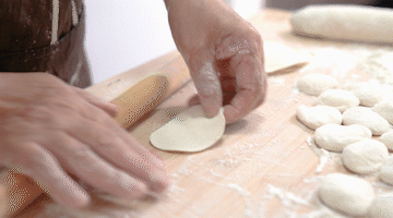 用擀面杖擀出中间厚,两边薄的面皮后,就可以开始包饺子。