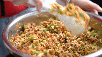 将切好的馅料掺好,同时放入适量的酱油、松茸鲜、食盐、胡椒粉、姜粉,进行充分的搅拌。