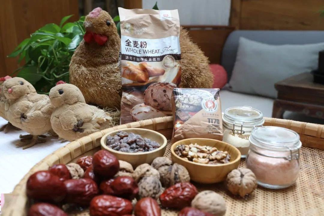 制作面包像画画一样,准备好面粉、红枣、核桃、葡萄干等原料,把红枣打成泥,核桃炒熟后切碎。