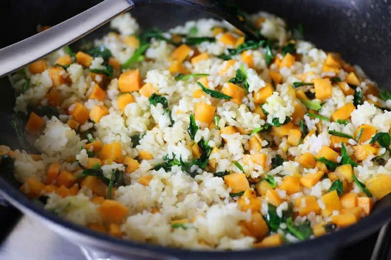 4.红薯丁蒸熟加菠菜香油小火烹香;