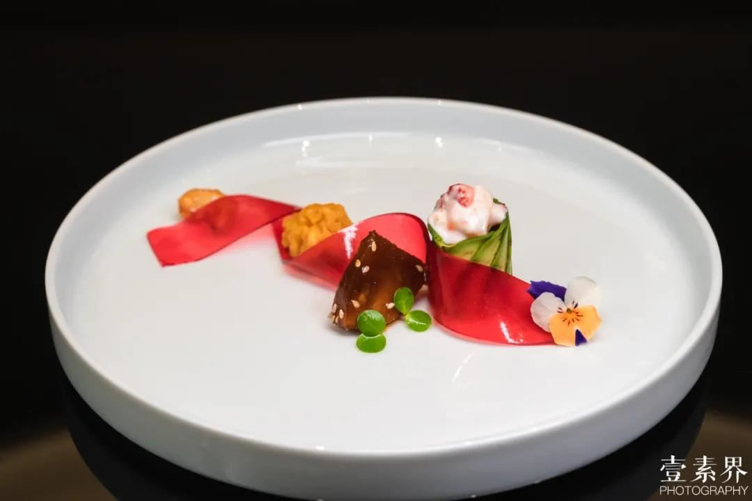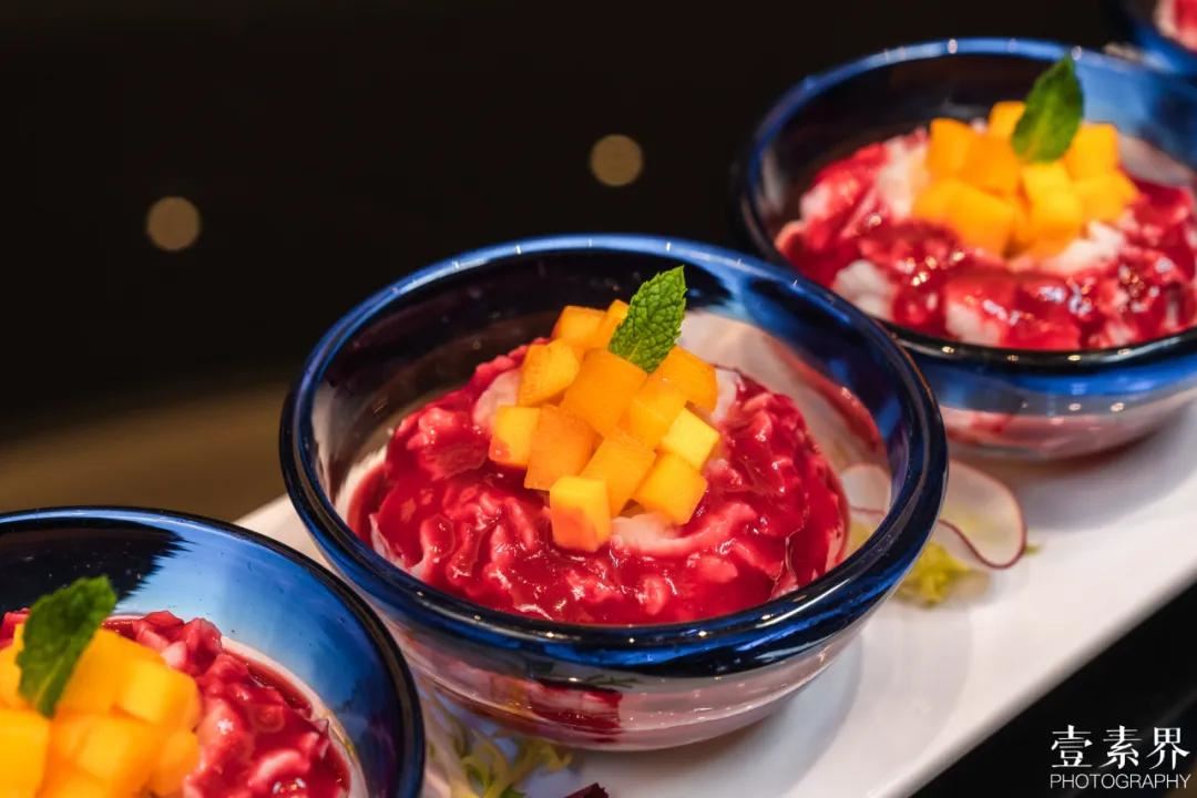 看起来、吃起来都有些像冰淇淋的一道凉菜,红色的树莓酱浇淋在白色的山药泥上,再点缀上芒果颗粒,看起来很是诱人,因此也成为了很多食客来此必用相机‘打卡’的一道菜品。