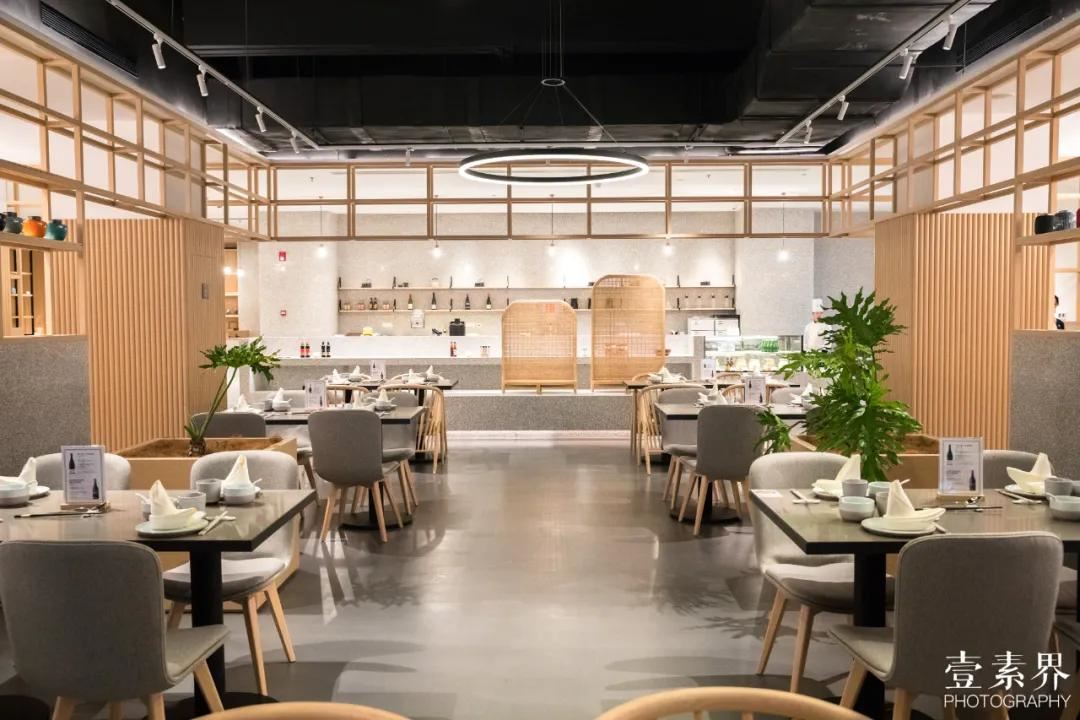 再往里走,右手边就是大厅的用餐区。浅灰与暖木色的椅凳搭配,柔和的灯光下,以及恰到好处的前后桌距,让客人在用餐时可以感受到一份舒适与自在。