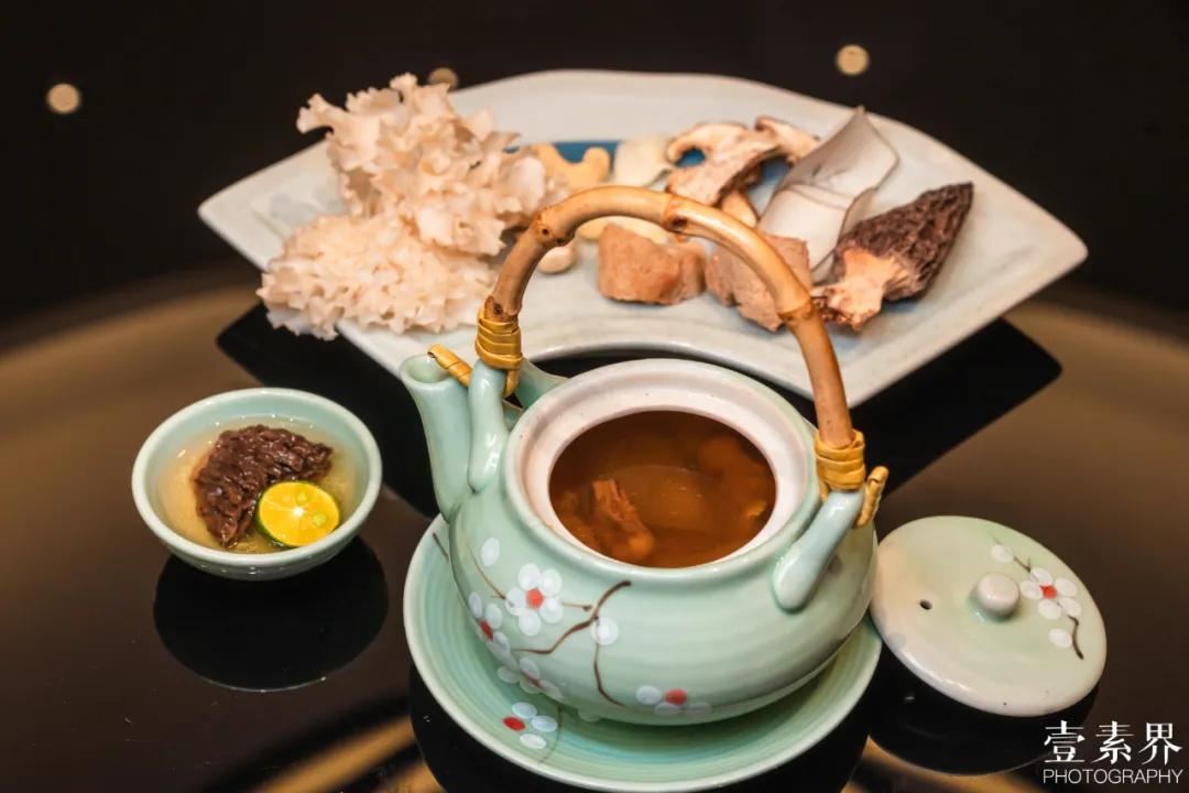 选用了干松茸、羊肚菌、绣球菌、海底椰等菌类食材炖出来的汤品,还未开盖便能感受到扑鼻而来的一股菌菇香气。