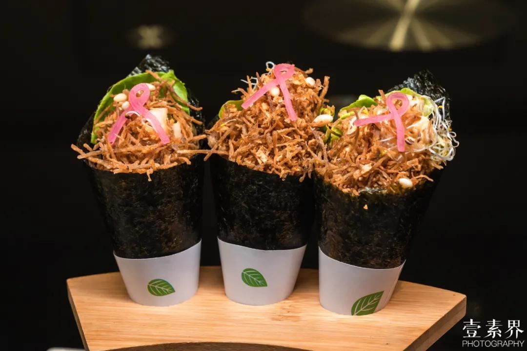 大厨特别推荐,一定要吃的招牌菜!这款手卷选用了蔡师傅去产地特选的A级海苔,加上铁质含量很高的牛蒡,及禾果自家菜地里的苜蓿芽,吃起来的口感酥脆且清爽。最关键的还有一个秘方:就是里面的沙拉酱是用很棒的豆乳加上地瓜一起打,口感清香又细腻,亦更美味与健康。