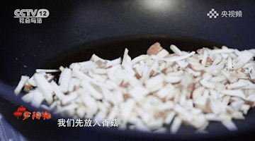 香菇炒到变小变干后,加入腐竹。炒到腐竹微微有点金黄色,就可以了。腐竹一炒变成丝丝状的了,吃起来也会特别像鱼肉。
